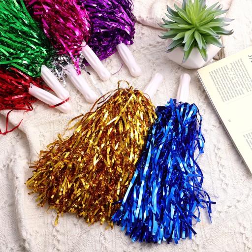 - Виготовлені з високоякісної металевої фольги яскравих і блискучих кольорів, вони дуже міцно кріпляться до пластикового тримача, і їх нелегко впасти під час використання. Ручка гладка і зручна, завдяки чому помпони дуже зручно тримати. Ідеально підходить для підтримки команд, гравців, матчів, вечірок, танцюристів, глядачів і декорацій вечірок.