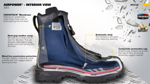 Внутрішня частина взуття – 3-шаровий ламінат CROSSTECH ®, водонепроникний і дихаючий. Підкладка, стійка до стирання. Забезпечує комфорт використання в будь-який час року. Найвища стійкість до проникнення крові та біологічних рідин. Підвищений хімічний захист.