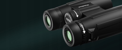 Ручки фокусування з двома різьбами - ручка фокусування та кільце налаштування діоптрій - збільшують тертя між пальцем і ручкою, дозволяючи фокусуватися швидше та точніше під час спостереження за об'єктами, що постійно рухаються. Поворотні наочники полегшують фокусування людям в окулярах.