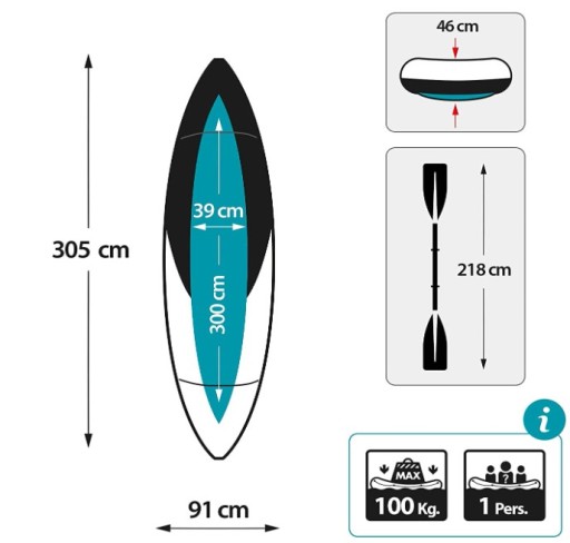 - Приблизний розмір у надутому стані: 305 см x 91 см x 46 см ідеально підходить для однієї людини (макс. 100 кг)