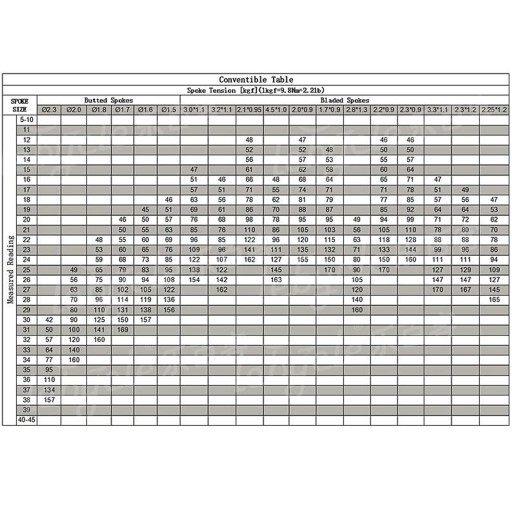 Легко читається, перейдіть до порівняльної таблиці натягу спиць, яка точно відповідає значенню, виміряному тестовим приладом.