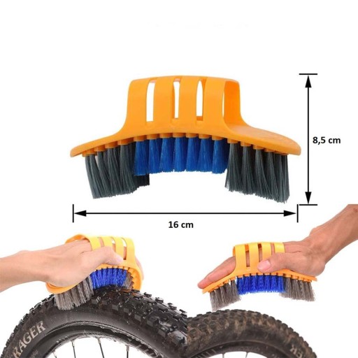 Універсальна щітка з щільним ворсом і зручною ручкою дозволяє чистити, серед іншого, спиці, гальмівні диски, педалі, велобагажник та багато іншого.