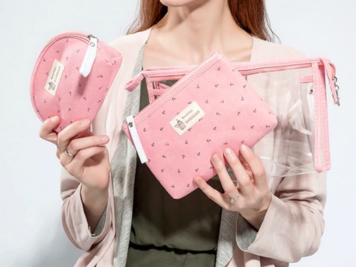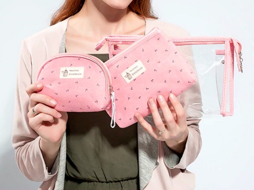 - Набір складається з трьох косметичок - одна прозора, дві тканинні