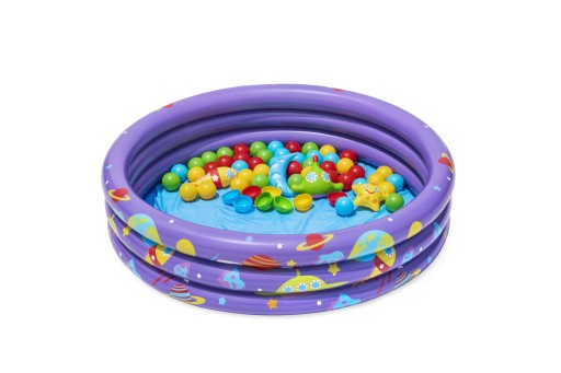 Барвистий космічний басейн збереже прохолоду в спекотні дні.Він складається з 3 рівних надувних кілець, які забезпечують стійкість всієї конструкції. Кожне кільце має блокатор, що перешкоджає витоку повітря. Басейн виготовлений з міцного вінілу товщиною 0,19 мм з оригінальним тисненим малюнком.