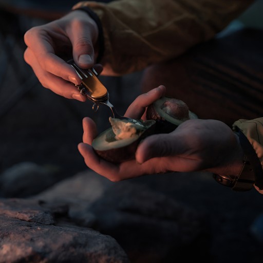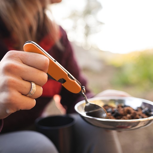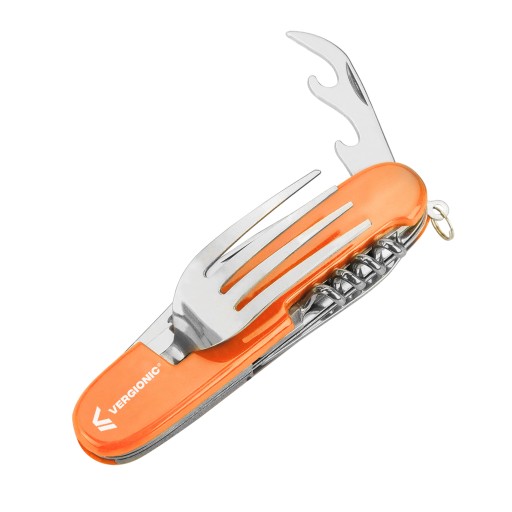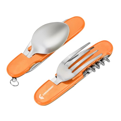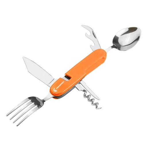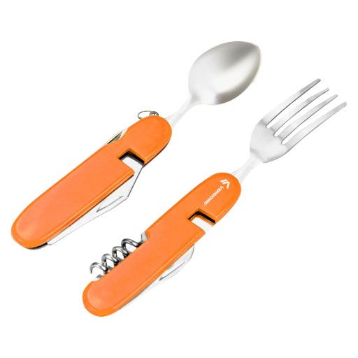 Завдяки невеликому розміру поміститься в невелику сумку, рюкзак і навіть в кишеню. Крім того, він має невелике кільце, яке дозволяє прикріпити його до блискавки, рюкзака або ключів. У наборі 6 елементів - ніж, виделка, ложка, відкривачка для консервів, відкривачка для пляшок і штопор. Більше того, його зручно від'єднати і одночасно використовувати для їжі повнорозмірного посуду - ніж з виделкою або ложка з виделкою. Це дозволяє їсти як супи, так і макарони або м’ясні страви.