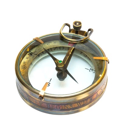 По краю напис англійською мовою: «Подорож у тисячу миль починається з одного кроку». Компас слід розташувати на рівній поверхні, наприклад, на карті, що лежить на столі. Має систему безпеки, яка фіксує голку. Як тільки цей фіксатор буде звільнено за допомогою гвинта, компас почне працювати. Через деякий час роботи амплітуда відхилень голки буде зменшуватися, поки напрямок остаточно не стабілізується. Компас слід розташувати так, щоб червона стрілка збігалася з напрямком на північ. Після стабілізації голка може злегка тремтіти. Зчитувачі карт – це точні компаси, вони використовуються для точного визначення азимута подорожі чи маршруту. На внутрішній стороні компаса є точна кутова шкала в діапазоні від 0 до 360 градусів. що дозволяє визначити азимут, тобто кут між північчю та потрібним місцем, вибраним на карті. Перед закінченням роботи голку слід зафіксувати.