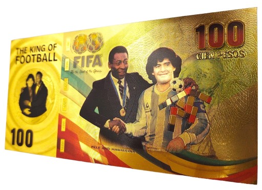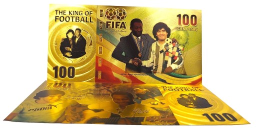 Красива позолочена банкнота із зображенням зірок світового футболу Пеле та Марадони.