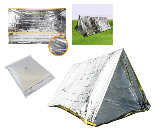Термічний рятувальний намет. Відмінне рішення, яке використовується в туризмі, альпінізмі та рятувальній справі. Намет є надзвичайно універсальним і може також використовуватися як класичний спальний мішок або велика ковдра для екстрених випадків. Завдяки компактним розмірам його дуже легко транспортувати, його вага всього 170 г! Використана фольга NRC є водонепроникною, що робить її ідеальною ізоляцією від холоду, вітру та складних погодних умов, запобігаючи охолодженню тіла.