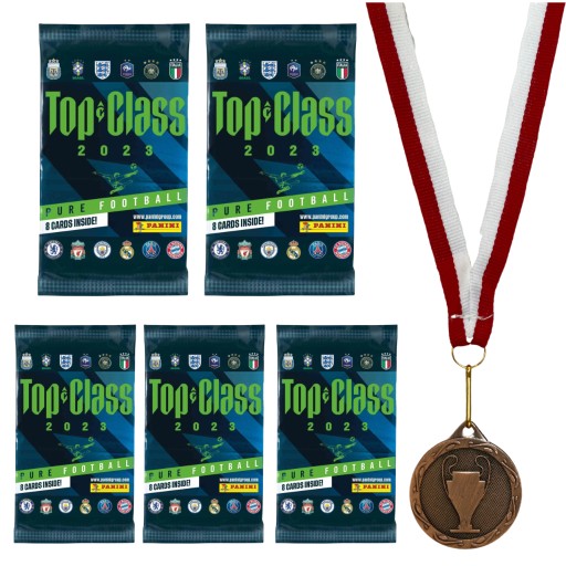 НАБІР ФУТБОЛЬНИХ КАРТОК X5 PANINI TOP CLASS 2023 5 УПАКОВОК 40 КАРТОК + КОРИЧНЕВА МЕДАЛЬ ЗІ СТРІЧКОЮ