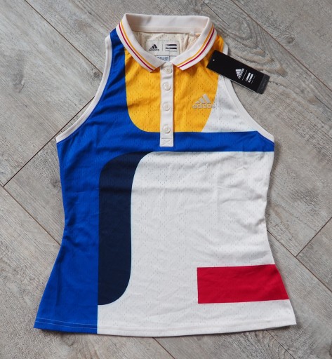 Дуже стильна жіноча тенісна сорочка без рукавів з коміром на гудзиках, виготовлена з сітчастого матеріалу, який забезпечує вентиляцію та вільний потік повітря. Створені для тренувань або матчів з унікальної колекції adidas PHARRELL WILLIAMS для турніру US Open 2017.