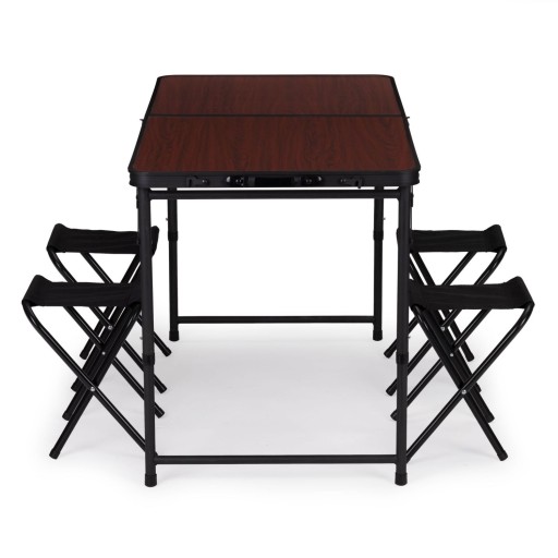 Стіл виготовлений з якісних матеріалів. Поєднання алюмінієвої каркасної конструкції зі стільницею з МДФ забезпечує міцність і стійкість столу. Перевагою є його мала вага, що забезпечує безпроблемне транспортування. Стіл легко розкладається, а в складеному вигляді набуває форму зручної валізи. Вбудована ручка полегшує перенесення. Додатковою функцією є можливість регулювати висоту столу.