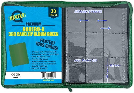 - ? Arkero-G: 18-кишенькова швидкозмінна папка на блискавці зеленого кольору. Високоякісний змінний колекційний альбом зі штучної шкіри складається з 20 міцно скріплених сторінок, кожна сторінка має 9 кишень на передній і задній сторонах.