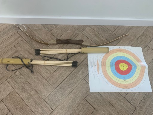 - Комплект поставки Набір дитячого лука Дерев'яний лук 100 см, 20 стріл, 4 паперові мішені та 2 футляри