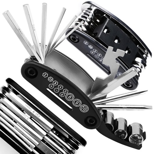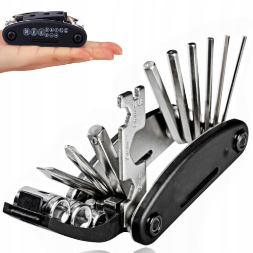 Зручний набір велосипедних ключів містить 16 найпопулярніших і найбільш часто використовуваних ключів, які використовуються під час їзди на велосипеді. У набір входять: шестигранні ключі, викрутки, розетки, перехідник, ріжкові та спицеві ключі. У складеному вигляді він займає мало місця, тому його можна тримати в кишені або сумочці.