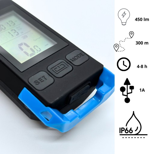 ЛІЧИЛЬНИК - Лампа оснащена дисплеєм, на якому ми можемо перевірити всю найважливішу інформацію з нашої подорожі. Такі як: швидкість, час, пройдена відстань, година, температура, кількість калорій, найвища швидкість, середня швидкість, загальний час тощо.