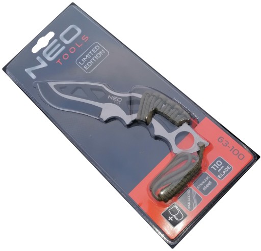 Ніж 63-100 із фіксованим лезом від NEO — це ніж із фіксованим лезом довжиною 11 см і товщиною 3,3 мм. Надзвичайно міцний і багатозадачний. Поставляється з паракордом 75 см на ручці, що славиться своєю високою міцністю. Ніж пропонується в нейлоновій сумці. Він ідеально підходить для кемпінгу, експедицій на виживання, а також для роботи в майстерні та гаражі.