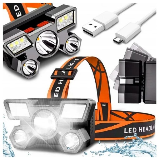 ГОЛОВНА ЛАМПА 5 x ПОТУЖНА СВІТЛОДІОДНА ГОЛОВНА ФАРА USB АКУМУЛЯТОР