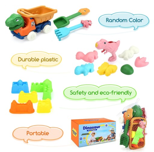 Пакет включає: 1 x Вантажівка з динозаврами, 1 x Пляжні граблі, 1 x Пляжна лопата, 1 x Лійка, 1 x Сітчастий мішок, 5 x Формочки для замків, 6 x Формочки для динозаврів (Усі, крім Вантажівки для динозаврів. Кольори іграшок: випадковий).