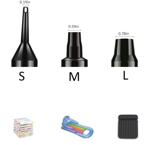 ???????? Три різні насадки: повітряний насос має 3 різні розміри насадок, включаючи S, M і L. Розмір S підходить для надування невеликих іграшок або кілець для плавання, M для ліжок, басейнів або сидінь і L для надувних матраців, басейнів або човнів.