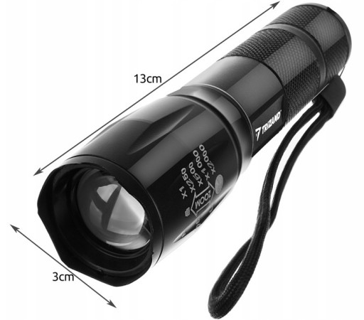 Ліхтарик неймовірної потужності, оснащений плавним регулюванням - ZOOM - фокусування пучка світла від дуже широкого до високофокусованого x1, x250, x500, x1000, x2000. Це дозволяє максимально сфокусуватися на одній віддаленій точці (максимальна дальність залежить від прозорості повітря - туман і пил зменшать її) або освітлити велику площу на невеликій відстані.