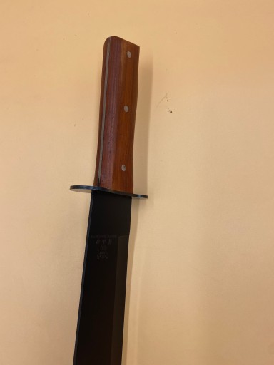 Зручна і зручна ручка, адаптована до руки європейця, виконана з обшивки з натурального дерева, прикріпленої до сталевої рами за допомогою заклепок.