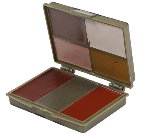 Продукт німецької компанії Mil-Tec®. Ідеально підходить для маскування обличчя та рук. Функціональний ящик з міцного пластику на 7 відділень з кольоровою фарбою для різних пір року і різних типів місцевості.