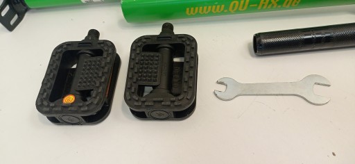 Широка квадратна вилка забезпечує достатньо місця для розміщення ніг на міцно утримуваній пластиковій педалі.
