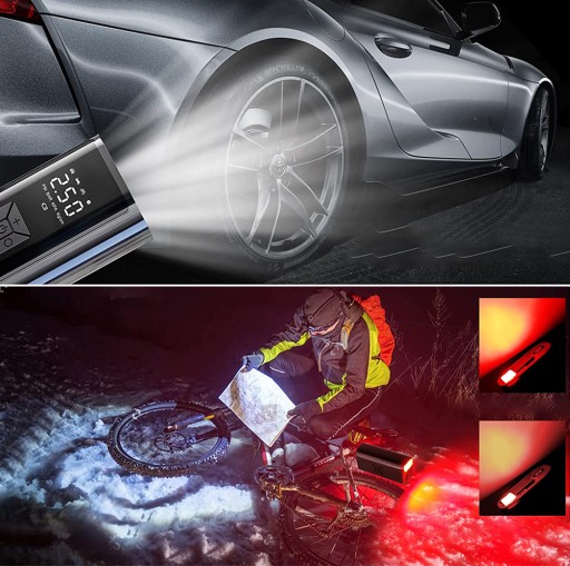 - Цей повітряний насос оснащений світлодіодним освітленням у верхній частині з трьома режимами, а саме світлодіодним освітленням, попереджувальною лампою та аварійним світлом SOS (освітлення, стробоскоп, SOS), для нічної зарядки та аварійного освітлення, ви можете перемикатися між різними режимами.