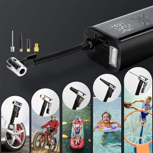 - Цей бездротовий повітряний насос поставляється з кількома різними допоміжними насадками.