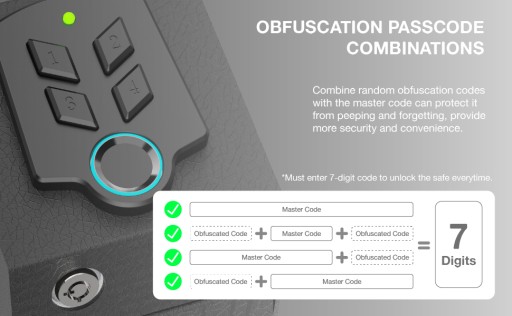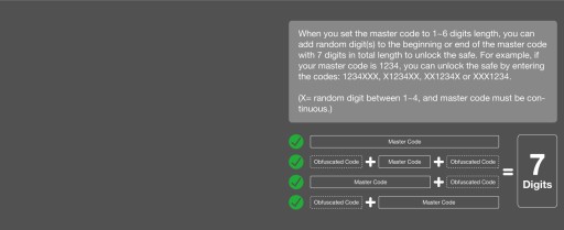 Відповідно до сертифікації Міністерства юстиції Каліфорнії безпечні паролі мають містити 7 цифр. Для зручності ви також можете встановити головний пароль довжиною від 1 до 6 цифр і додати випадкові числа до головного пароля, щоб створити 7-значну комбінацію для відкриття сейфа, що також може запобігти підгляду пароля.