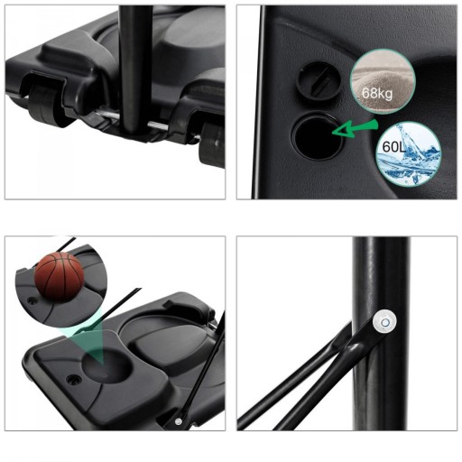 Стійкість і міцна конструкція: основа рами має камеру, яку можна заповнити піском або водою, щоб забезпечити стабільність без необхідності прикріплювати весь кошик до кошика. Трикутні опори та міцні з’єднання гарантують, що рама буде довговічною та придатною для гри протягом багатьох років. Матеріал PE, який використовується для створення щита, і сітка зі зносостійкого нейлону добре працюють незалежно від пори року та інтенсивності гри.