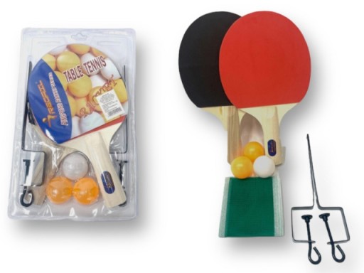 Набір складається з 2 ракеток, 3 м'ячів, сітки для столу та 2 металевих тримачів для кріплення сітки.
