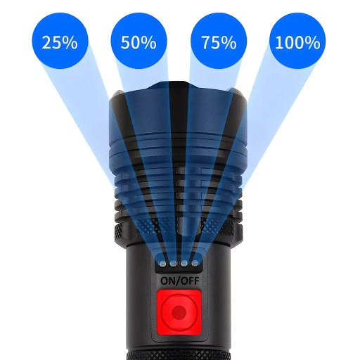 Зі світлодіодним променем XHP90, однокнопковим перемикачем, індикатором живлення, реле тиску, металевою трубкою, задньою кришкою та мотузкою.