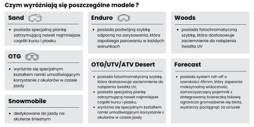 - Простота конструкції – усі окуляри 100% легкі, зручні та підходять до більшості шоломів відомих виробників.