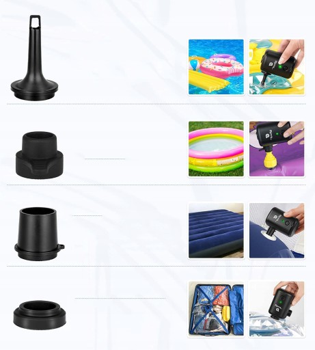 【4 різні насадки】 Електричний повітряний насос оснащений 4 різними типами насадок, щоб задовольнити ваші різні потреби в накачуванні. Він дуже підходить для надувних матраців, надувних матраців, надувних басейнів, плавальних кілець, дитячих басейнів, м’ячів для йоги, повітряних куль та інших надувних предметів. Крім того, його також можна використовувати у вакуумному мішку, щоб відсмоктувати все зайве повітря з вакуумного мішка. 【Швидке надування та здування】 Висока потужність 15 Вт, потік повітря 400 л/хв. Просто вставте повітряне сопло в клапан і увімкніть перемикач. Наповнення та спорожнення об’єкта займає від кількох десятків секунд до кількох хвилин (залежно від розміру об’єкта).