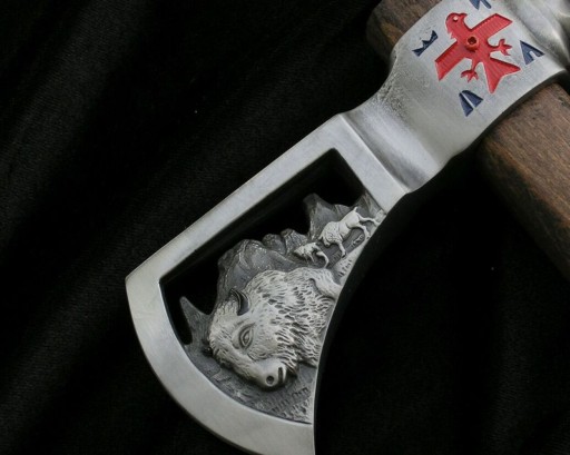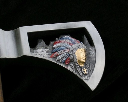 Клинок: високовуглецева сталь, гравіювання з обох сторін (мотив буйвола та голова вождя)