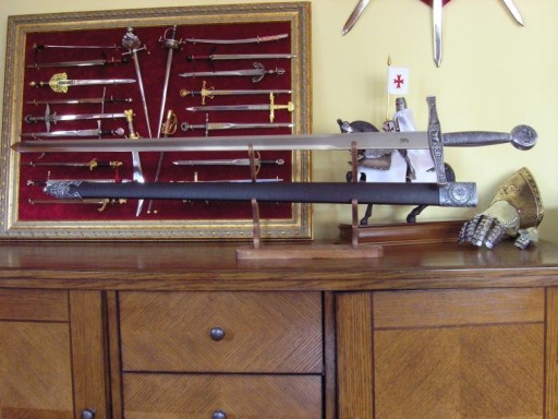 Чудово зроблена копія з хромованої сталі Толедо. Лезо тупе і не підходить для заточування. Верхня фурнітура піхов і рукоятка меча виготовлені з високовуглецевої сталі та багато декоровані. Ідеальний подарунок для любителів легенд про Артура.