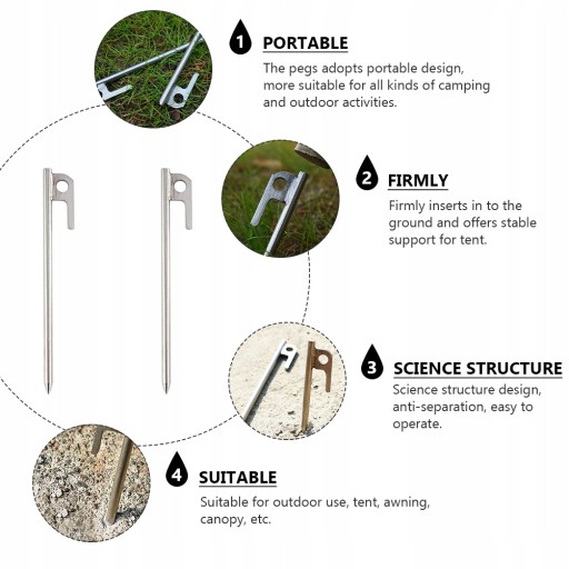 Цей предмет виготовлено з високоякісного матеріалу для міцного та тривалого використання. Кілочки мають портативний дизайн, більше підходять для кемпінгу та активного відпочинку. Він міцно ковзає по землі та забезпечує стабільну опору для намету. Підходить для зовнішнього використання, намету, тенту, навісу тощо.