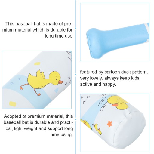 Ця бейсбольна бита виготовлена з високоякісного матеріалу, який розрахований на тривалий термін служби. Інтерактивний та веселий, його можна адаптувати до занять вашої дитини на свіжому повітрі. Він може вправляти дитячу координацію рук і очей і м’язи рук, а також представляє малюнок мультяшної качки, дуже красивий, завжди робить дітей активними та щасливими.