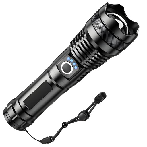 Зі світлодіодним променем XHP90, однокнопковим перемикачем, індикатором живлення, реле тиску, металевою трубкою, задньою кришкою та мотузкою.