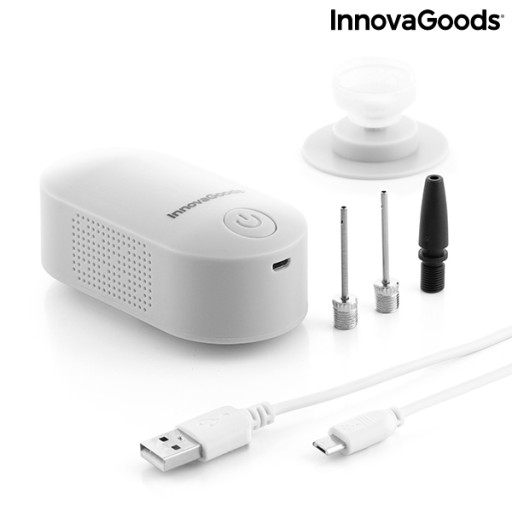 Бездротовий і портативний насос і вакуумний насос 2 в 1, багатофункціональний, компактний і легкий, який завдяки своїм невеликим розмірам практично не займає місця і його легко брати з собою в подорож. Його можна використовувати для вакуумного пакування, оскільки він вентилює клапанні мішки для зберігання одягу чи їжі тощо, а також для надування та вентиляції спортивних і водних предметів (таких як м’ячі, кільця для плавання...) тощо, оскільки може працювати як насос. Він працює 10-хвилинними циклами, а потім автоматично вимикається. Включає наступні аксесуари для надування та вентиляції: 2 металеві голки, 1 пластиковий компресійний наконечник і 2 всмоктувальні наконечники, адаптовані для вакуумних пакетів (сумісні з усіма вакуумними пакетами з клапаном).