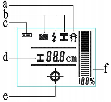 Помістіть вимірювальний інструмент на поверхню та рухайте його в тому ж напрямку. Коли детектор знаходиться близько до краю виявленого об'єкта, на РК-дисплеї відображається значок потужності сигналу. З’явиться середній значок. Загоряться жовті або червоні лампочки. Звуковий сигнал пролунає 3 рази; тримайте детектор у тому ж напрямку. Коли пристрій залишає інший край деревини, сигнал на дисплеї зникає, середня іконка вимикається, загоряється зелене світло, а зумер припиняє пищати.