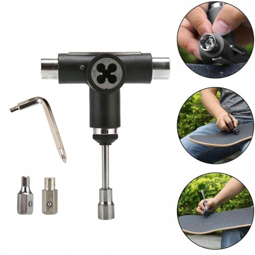 : Багатофункціональний універсальний інструмент із тріскачкою та ковзанами забезпечує все, що вам потрібно, щоб затягнути або відремонтувати скейтборд. Інструмент T-Skateboard містить гнізда 3 різних розмірів (3/8", 1/2", 9/16") та висувний викрутка з хрестовою головкою, яка надягає верхню частину ручки, коли не використовується. Цей інструмент для катання можна використовувати для заміни коліс, очищення підшипників, регулювання гаек осі, кріпильного обладнання та гайки шкворня на верхній частині вашої вантажівки Портативний і легкий, ви можете легко носіть і використовуйте його, коли вам це потрібно. Підходить для більшості типів скейтбордів, лонгбордів, пеннібордів, міні-круїзерів тощо