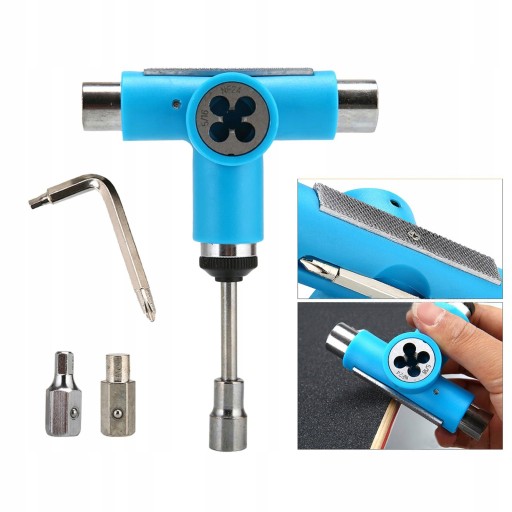 : Багатофункціональний універсальний інструмент із тріскачкою та ковзанами забезпечує все, що вам потрібно, щоб затягнути або відремонтувати скейтборд. Інструмент T-Skateboard містить гнізда 3 різних розмірів (3/8", 1/2", 9/16") та висувний викрутка з хрестовою головкою, яка надягає верхню частину ручки, коли не використовується. Цей інструмент для катання можна використовувати для заміни коліс, очищення підшипників, регулювання гаек осі, кріпильного обладнання та гайки шкворня на верхній частині вашої вантажівки Портативний і легкий, ви можете легко носіть і використовуйте його, коли вам це потрібно. Підходить для більшості типів скейтбордів, лонгбордів, пеннібордів, міні-круїзерів тощо