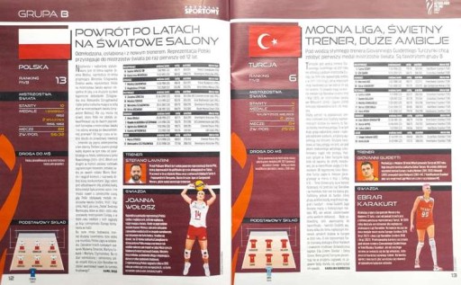СТАН: ДУЖЕ ДОБРИЙ Рік видання: 2022 Кількість сторінок: 28 Папір: крейдований Колір: так: Скарб фаната, підготовлений командою журналістів «Przegląd Sportowy» до фіналу Чемпіонату світу з волейболу серед жінок 2022 року, який проходитиме в Нідерландах та Польщі . У виданні представлено кожну з команд (склад команди, тексти про команду та головного гравця, біографія тренера з фото, інформація про успіхи, графіки з основним складом). Крім того, «Скарбниця вболівальників» містить додатковий текст про збірну Польщі, інтерв’ю з тренером збірної Польщі Стефано Лаваріні, детальну презентацію кожного польського волейболіста, розклад турнірів, презентацію арен Чемпіонату світу та все -хронологічна статистика Чемпіонату світу з волейболу серед жінок.