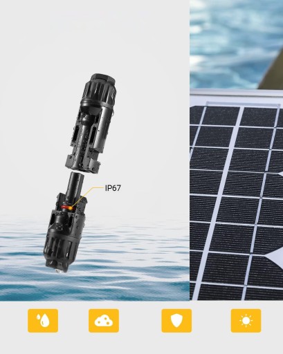 Опір роз’єму: 0,5 мм Ом Специфікація проводки: 2,5/4/6 мм Матеріал сердечника: луджене відкритого типу Діапазон температур: -40~+90°C Спосіб підключення: обжимний Робочий струм: 30 А Робоча напруга: DC1000 В Необхідний набір роз’ємів MC4 для підключення сонячних панелей до фотоелектричних систем. Завдяки міцності та високій якості виготовлення забезпечує тривалий термін служби виробу. Клас захисту IP67 гарантує захист від води та пилу. Крім того, конектори також стійкі до УФ-випромінювання.