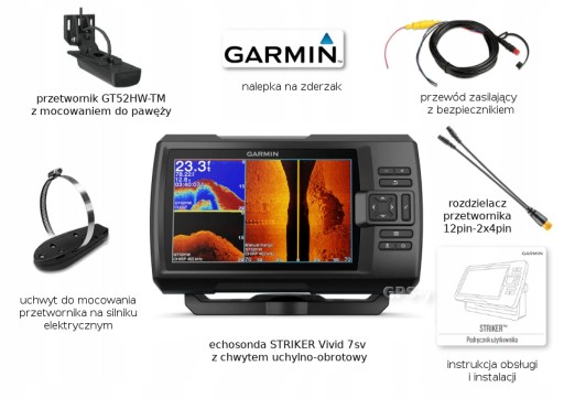 - Обладнання в комплекті - в комплект з рибальським ехолотом STRIKER Vivid 7sv входить кронштейн для нахилу і набір для кріплення на транець з кабелем.