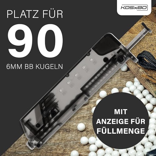 - Боєприпаси – цей автомат заряджання з м’яким повітрям вміщує 90 патронів, які можна заряджати з магазину без особливих зусиль.