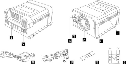 - Кабелі живлення: 230 В змінного струму + кабель із затискачами «крокодил» для акумулятора
