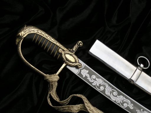 Ця шабля має повністю закриту латунну ручку з бантом, прикрашеним філігранню, і капюшон у вигляді голови орла. Хрестовина прикрашена мотивом мотузки. До лука кріпиться стропа.